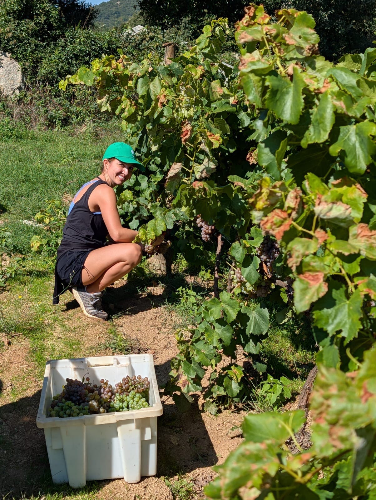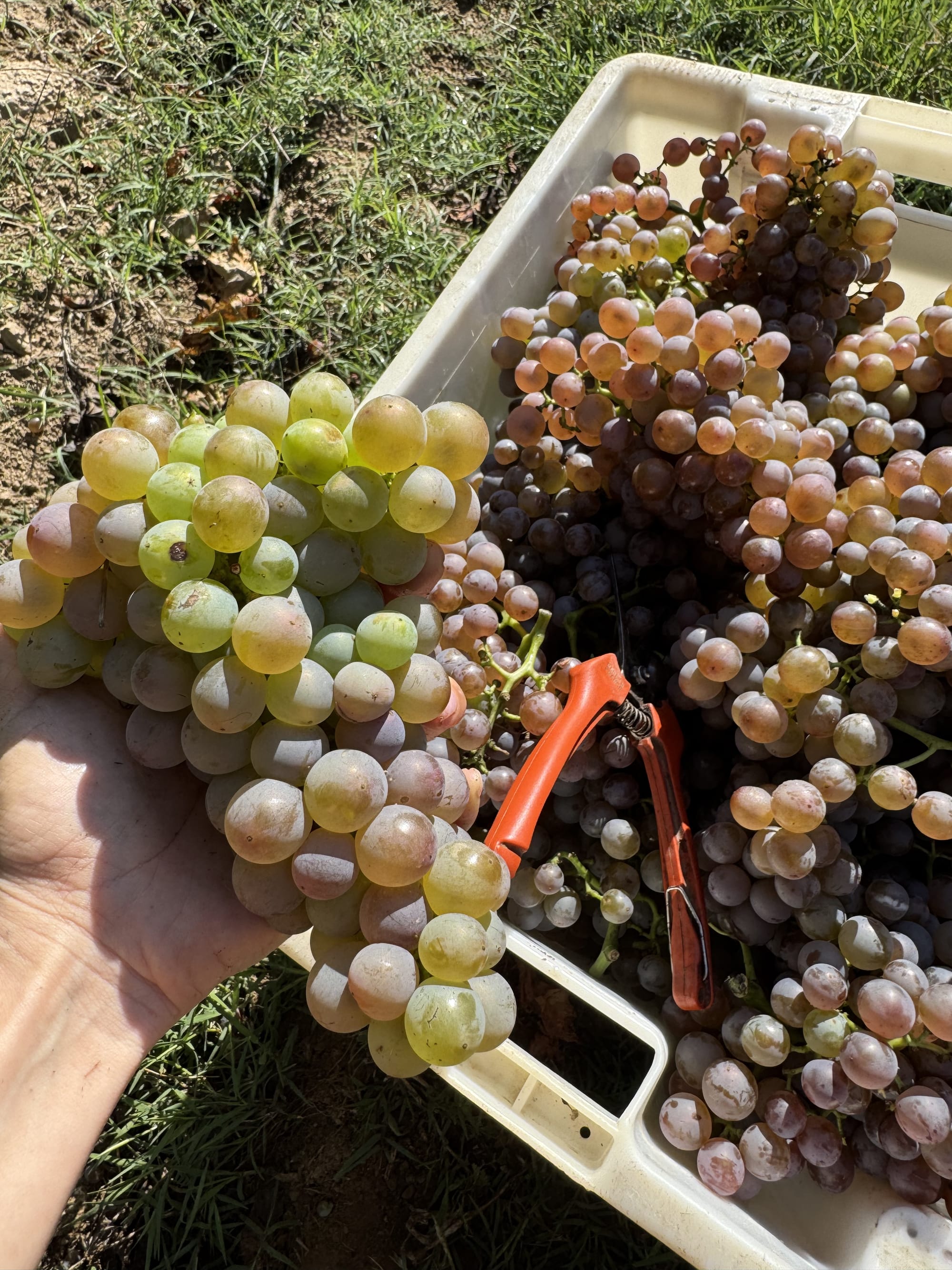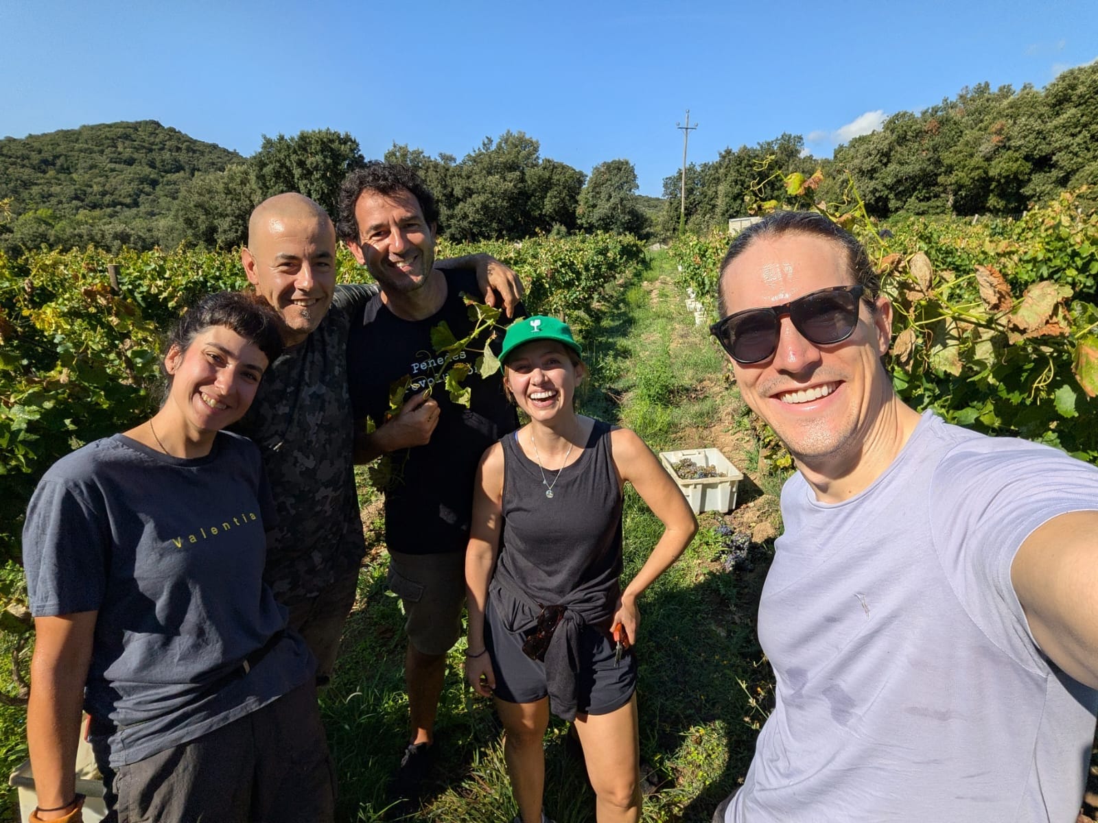Lorena and Jean-Philippe hand-harvesting healthy grapes that never touched chemicals with the fabulous Còsmic team. September 2025. Photos: JP